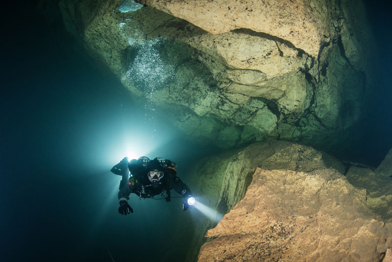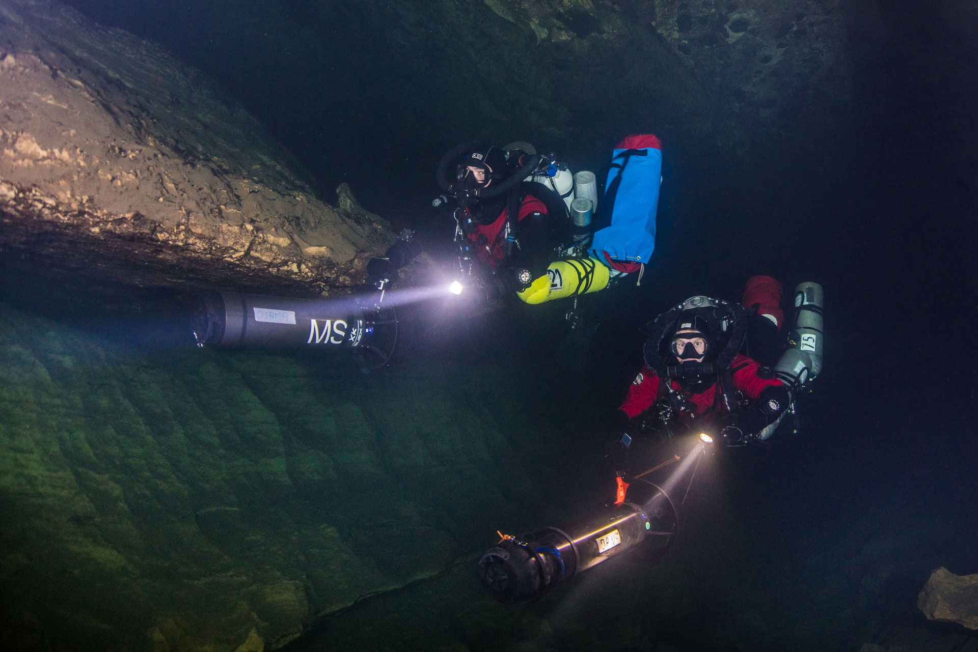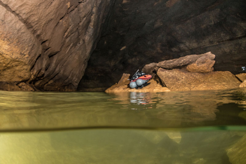 Der Gangverlauf setzt sich unterirdisch weit fort - der erste zu tauchende Abschnitt ist etwa 2km lang. Nach einer Kiesbank folgt ein großer "Höhlensee" und weitere Trockenstrecken mit teils scharfkantigen Gesteinsformationen. Danach folgt eine weitere kurze Tauchstrecke (Sump2) bis nach etwa 2,8 km die "Biwakhalle" erreicht wird.