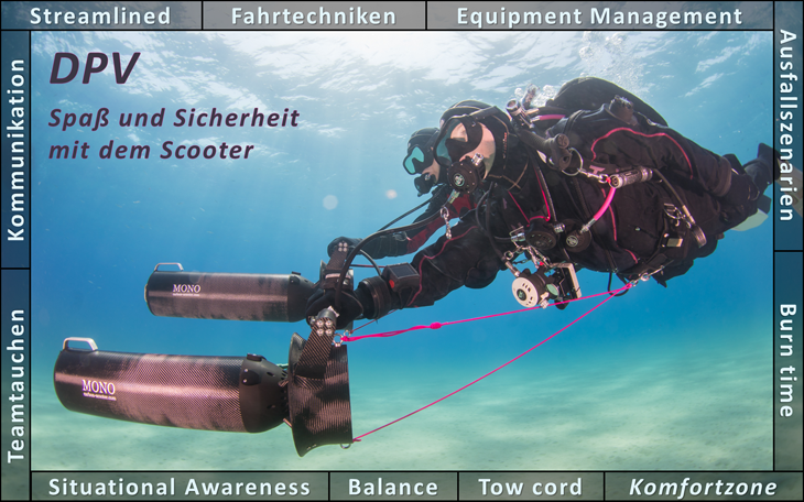 Grundlegende Problemlösungsfähigkeiten wie Gasspende, verschiedene Schlepptechniken eines anderen Tauchers mit z. B. ausgefallenem Scooter gehören ebenso dazu. Du erlernst wie vorzugehen ist, wenn sich z. B. Angelschnüre in Deinem Scooter verfangen hat oder wie Du die Gasplanung auslegen solltest.