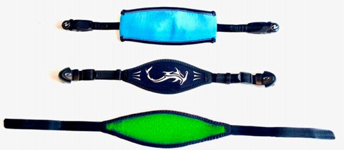 Abbildung 1 a-c: Verschiedene handelsübliche Maskenbändern von oben nach unten: a) Silikon-Maskenband mit Kunststoff-Mechanismen und zusätzlichem Neopren-Überzug, b) Textil-Maskenband mit Kunststoff-Mechanismen und Neopren-Mittelteil für den Hinterkopf, c) Neopren-Maskenband mit Klett.